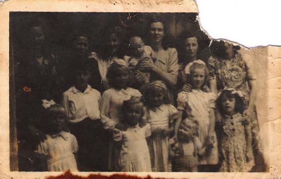 Van links Jaan Verkerk, Marie Boere- van Dijk , Ton van der Zande Boere, Wies de Jong-Boere, met op de arm Ton de Jong, Marie Hufner-Boere, Bets Hardeveld-Boere, Christien Verkerk, Piet de Jong, Annie van der Zande, Nel de Jong en Leo de Jong, Ria de Jong, Ria Hufner en Riet Hardeveld, Communiefeest Van Ria de Jong